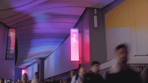 We design the event as one connected journey, carrying visual cues like grids, transparency, and light diffusion from entry to exit. That through line peaked in the Welcome Moment, the main pathway into the Keynote and Expo halls. Illuminated cube structures synced with surrounding screen content, turning a high-traffic corridor into an immersive, portal-like transition.