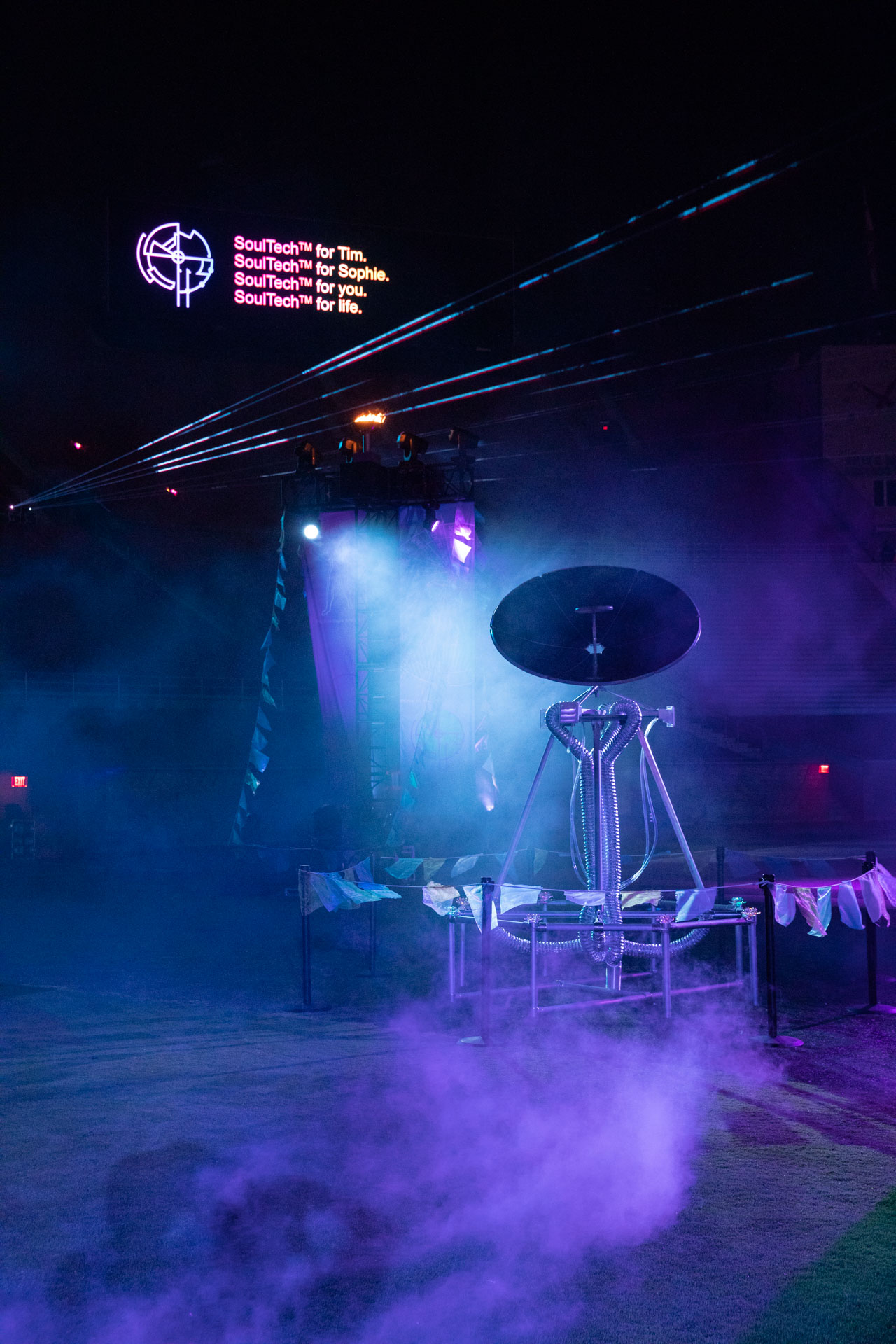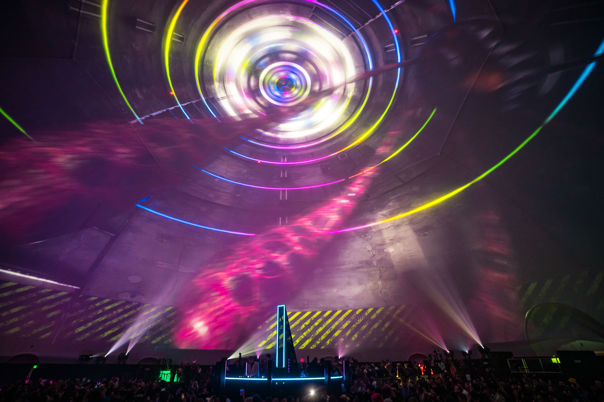 For the first time ever, attendees at the LA Coliseum experienced time travel, inter-dimensional portals, group apotheosis, and banishment as part of a ritual of musical transcendence. All this to save the world of the future. The ritual took place in a 200 ft wide by 75ft tall inflatable dome where esoteric and ecstatic visions were projected to entrance all attendees. Spiritual sustenance and enhanced nutrition was provided to initiates all night. Soulvation was achieved.