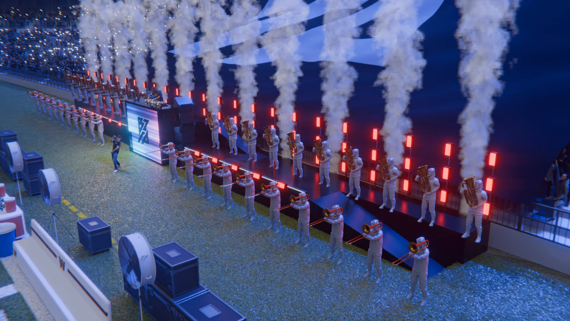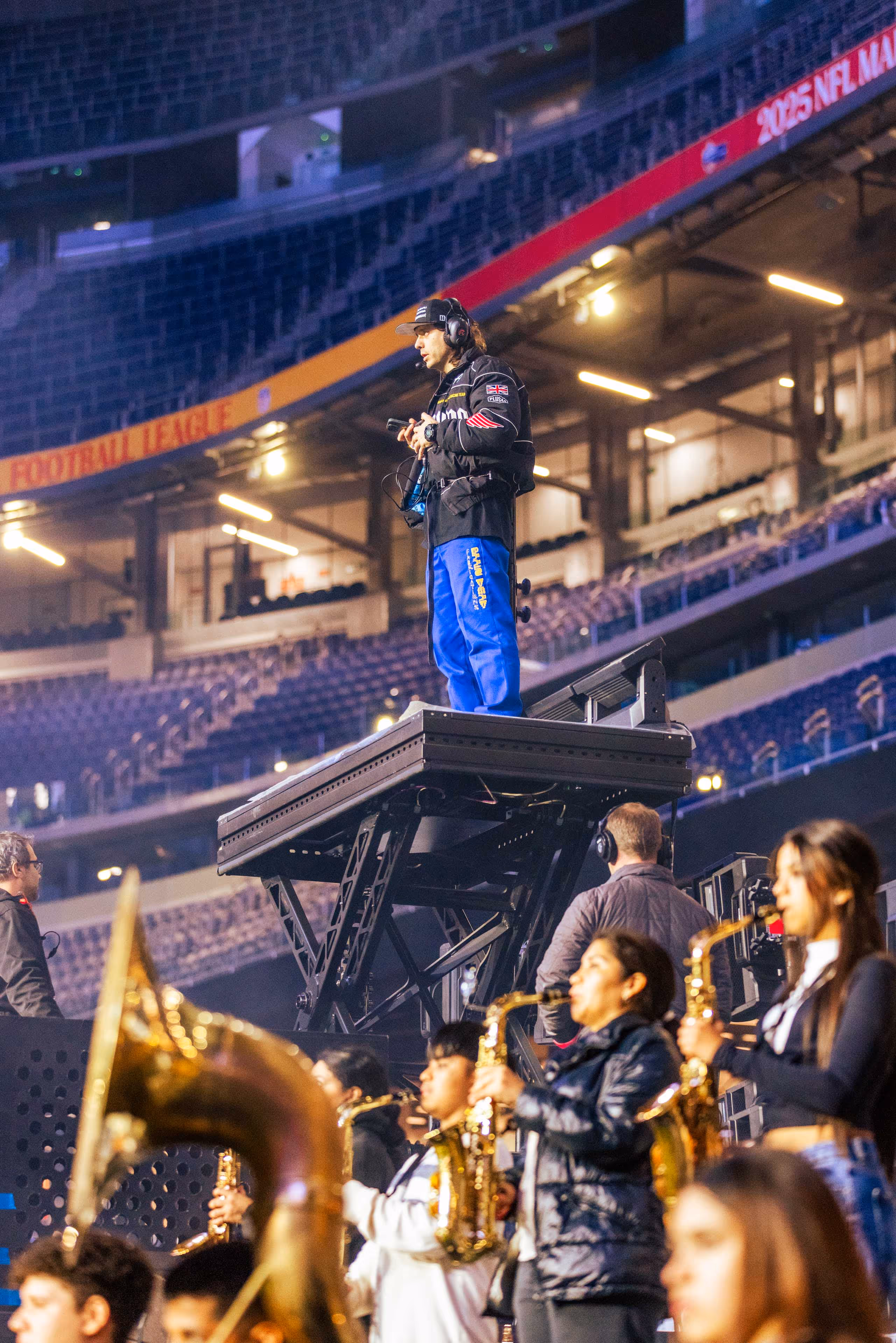 Since the arrangement of Bizarrap’s opening halftime track called for a big band with a full brass section and percussion—a core feature of the production design would include a horizontally elongated stage to highlight their presence. Visuals for Bizarrap branding were made custom by Production Club and featured on the front of the DJ booth as well as the giant flown halo screen and LED ribbons throughout the stadium. As for Daddy Yankee’s appearance, we designed a multi-tiered DJ booth which would allow both Biza and Daddy to be elevated and lowered throughout different parts of the song structure.