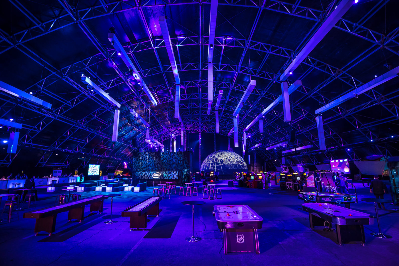 To the east was the blue megastructure designed for digital experiences. Attractions included a musically choreographed laser dome, oversized and custom built video games, data flow inspired lounge, and a curated retro arcade. The structure also featured the Intel sponsored light cube, an interactive installation that we designed, programmed, and engineered custom software to power.