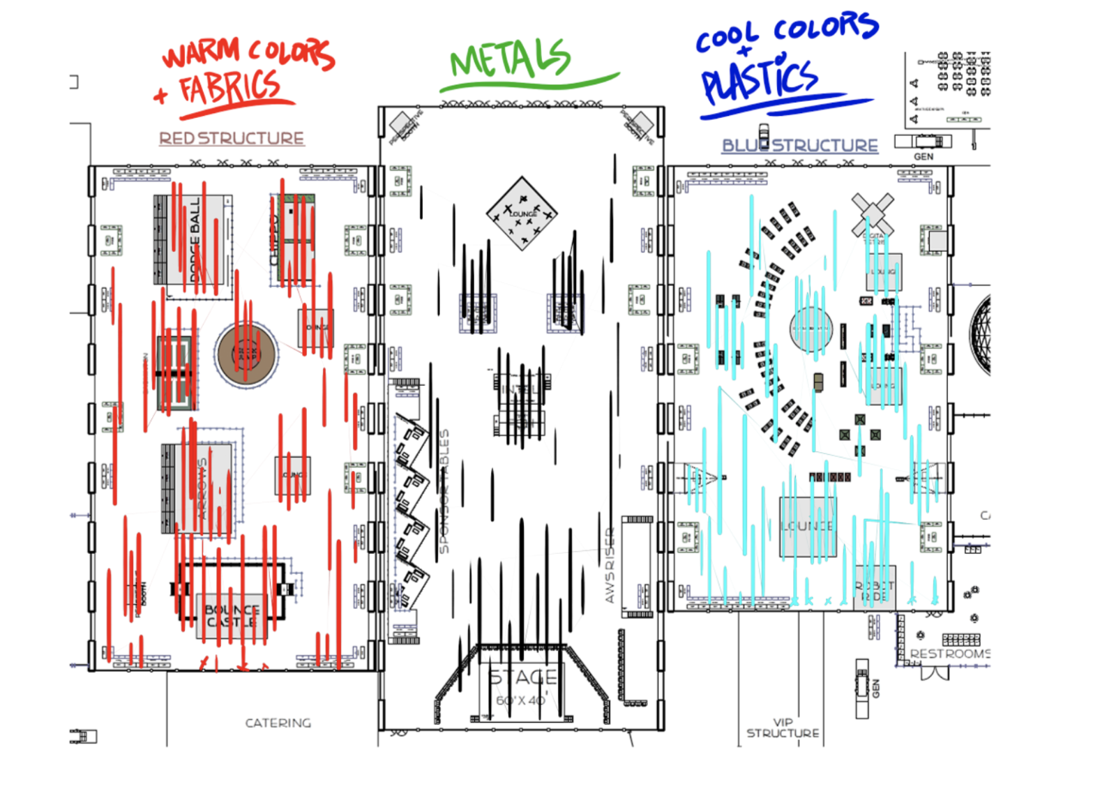 Activities were divided across the other 2 megastructures: To the west we designed a red megastructure with a focus on physical competition and achievement. Here we encouraged high energy activities including 2 custom designed inflatables: a castle accompanied by a 250,000 ball pit moat and an inflatable wall climb and slide race. Competitive team games included arena style arrow tag, dodgeball, and bubble soccer fueled by surrounding crowds cheering every shot and close call.